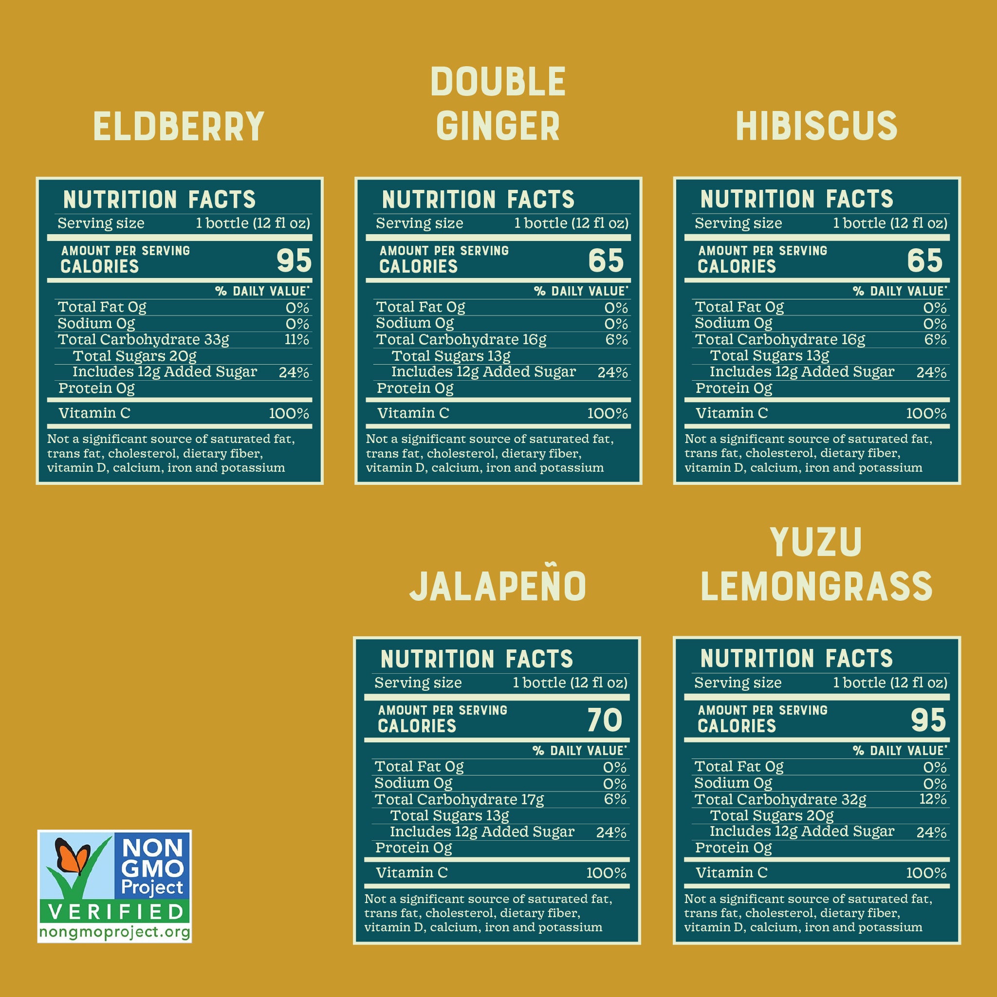 Each Variety Pack comes with the following flavor variations: 2 Hibiscus, 2 Yuzu Lemongrass, 2 Double Ginger, 2 Elderberry, and 1 Jalapeño
